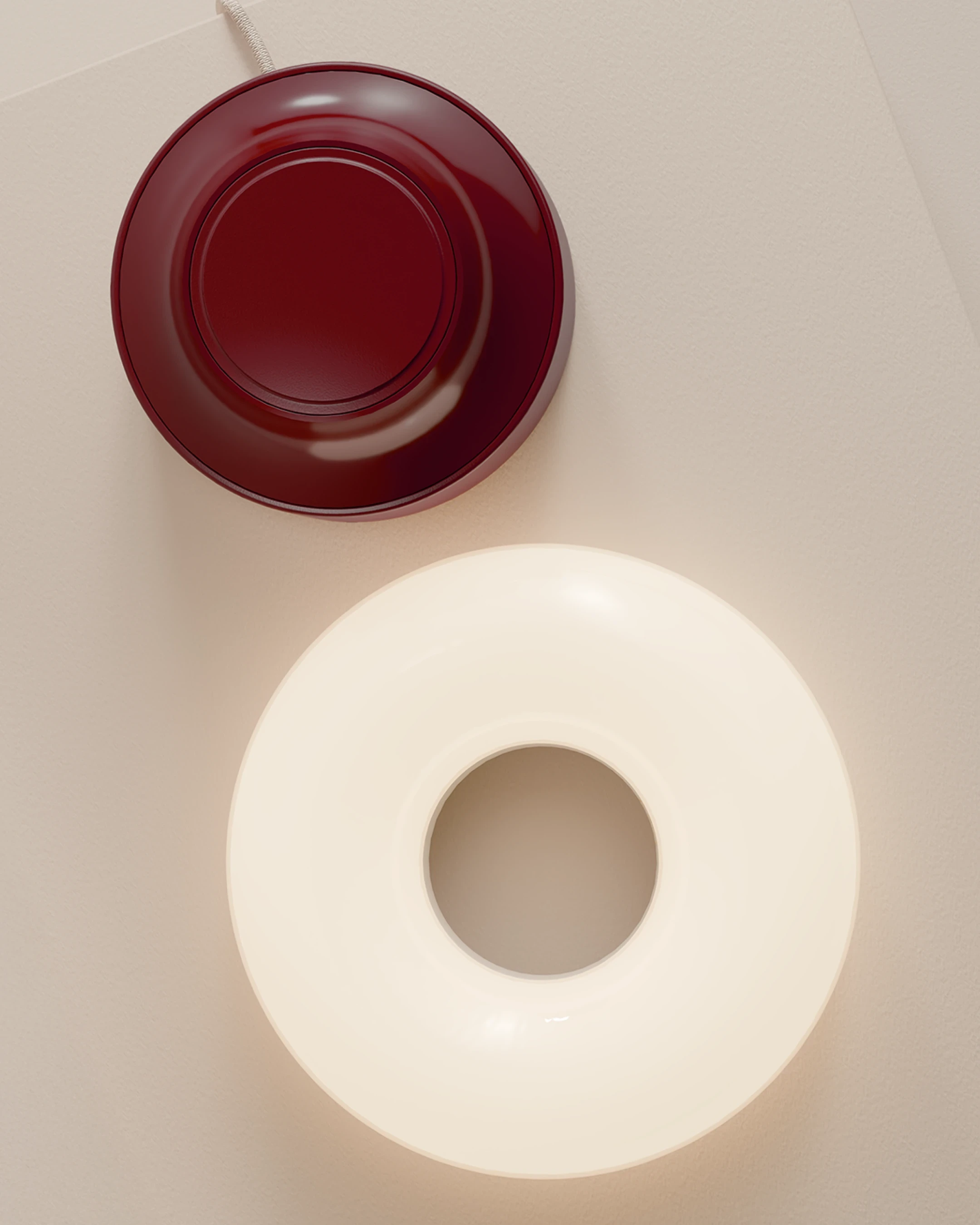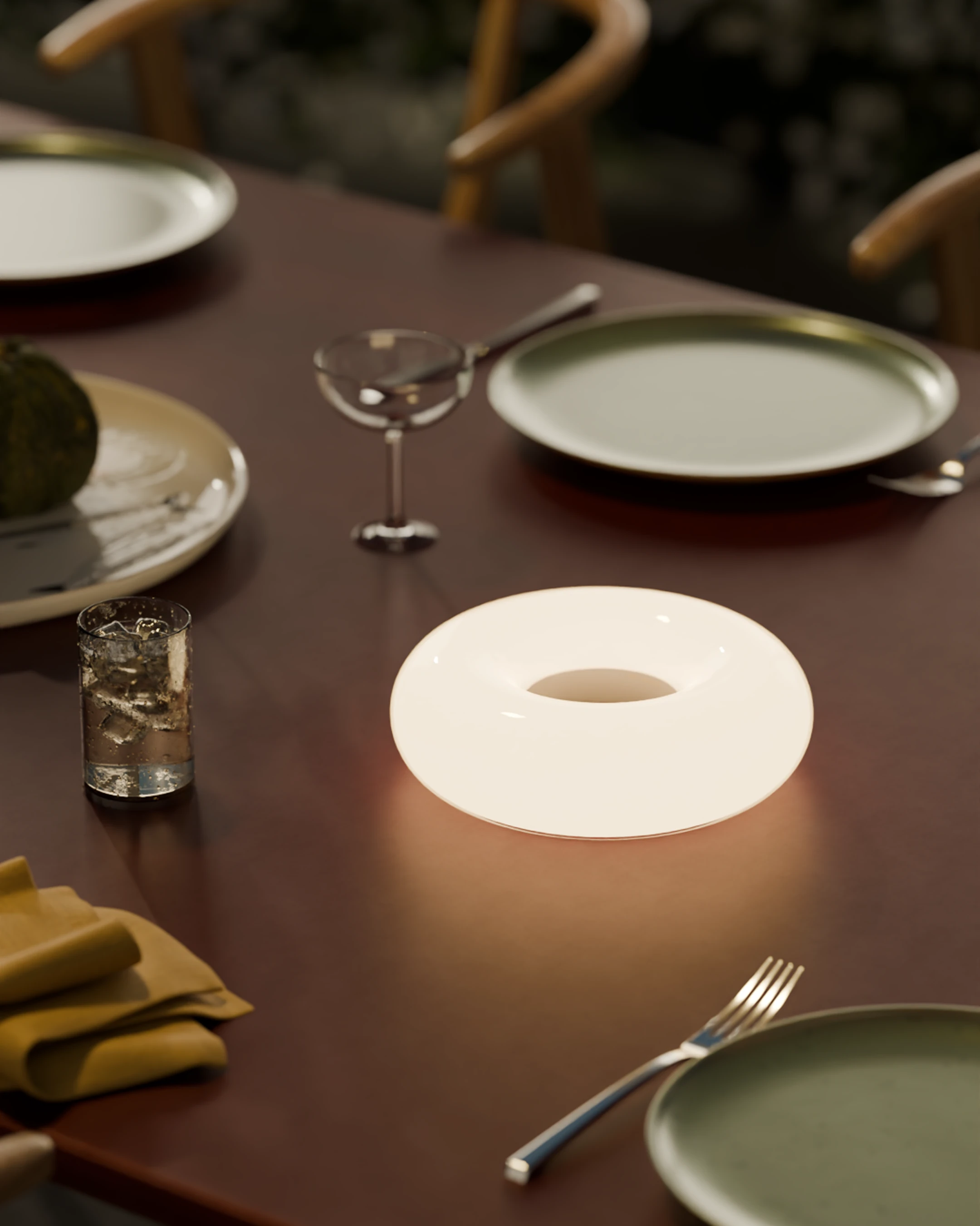 The ILO Light is presented as a hybrid lamp designed for both indoor and outdoor use. It is made of two parts: a portable ring light and a fixed base that functions as a charging dock. When the ring is placed on the base, charging is completed wirelessly through induction. Together, the elements form a calm, modern lamp for everyday interiors. Used separately, the portable light is suited for terraces, tables, or shared spaces, offering flexible lighting through a compact and refined form.