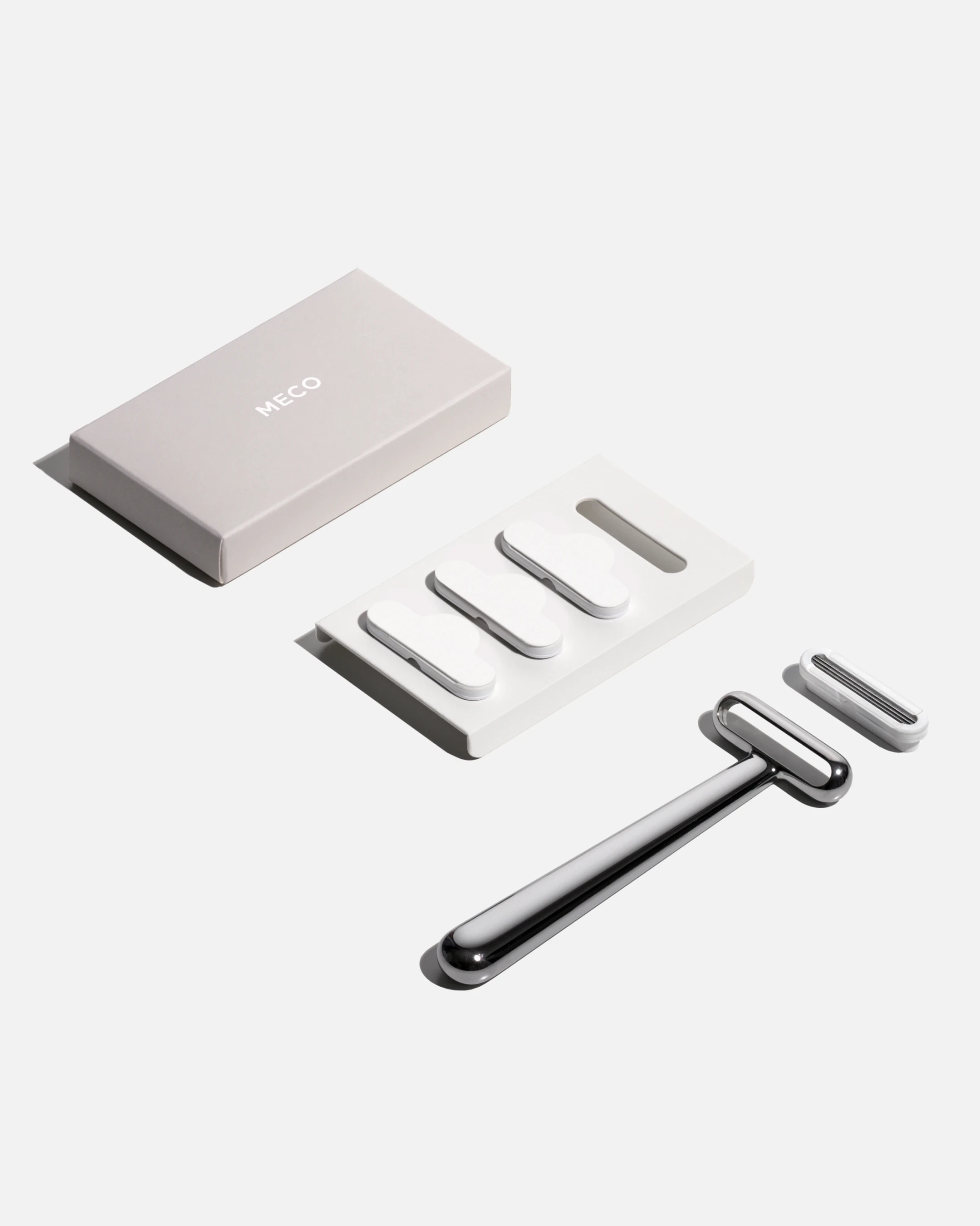 The MECO Razor was developed to prioritize utility and restraint in the shaving process. A stainless steel handle was engineered to mount magnetically to wall surfaces, allowing the tool to integrate into modern home environments. Magnetic attachment was also utilized for the cartridges, which were designed with an open-loop structure to facilitate efficient rinsing. To minimize environmental impact, the product was packaged entirely in paper-based materials. Core shaving functions were distilled into an essential form, ensuring that durability and sustainability were balanced within a straightforward design language.