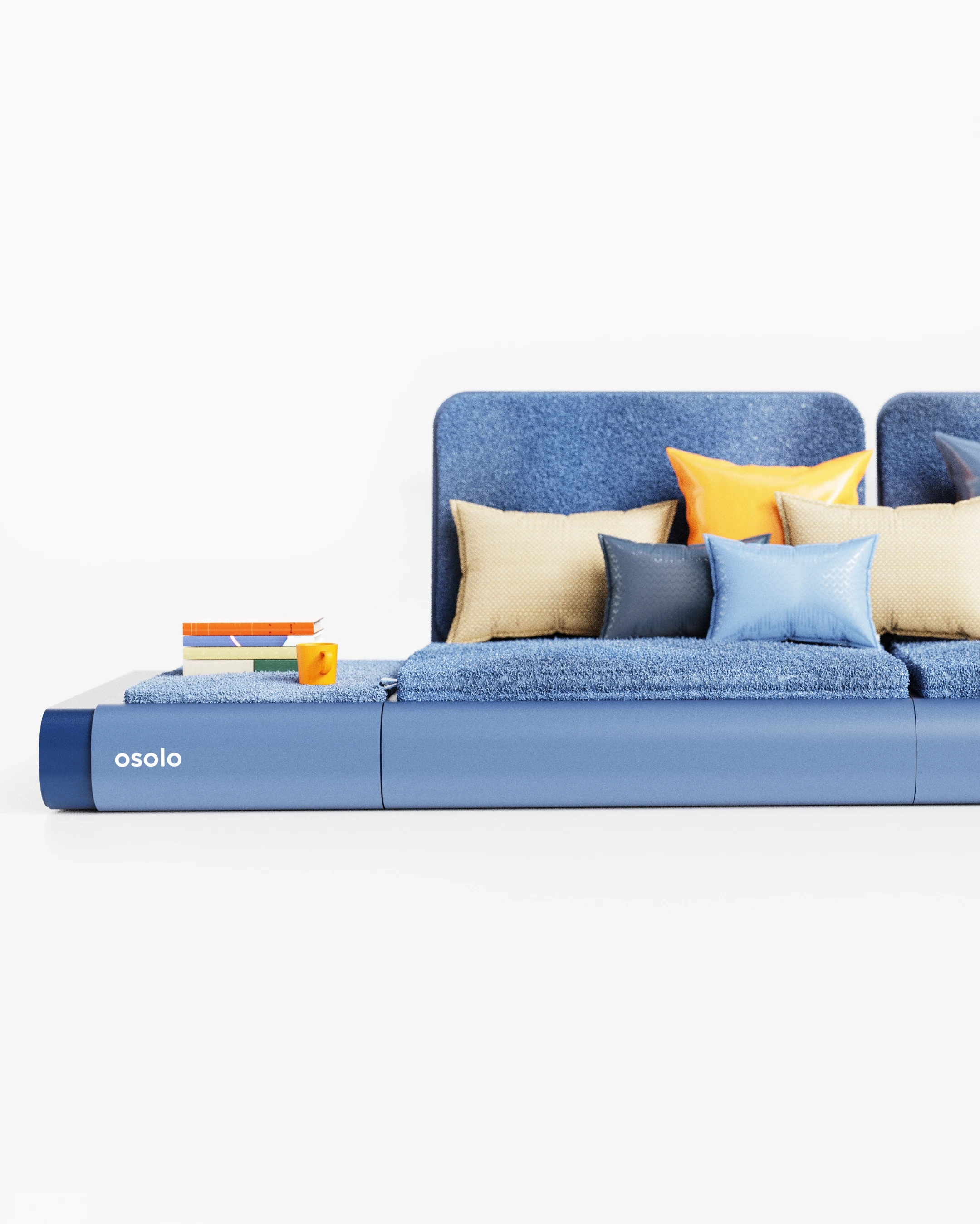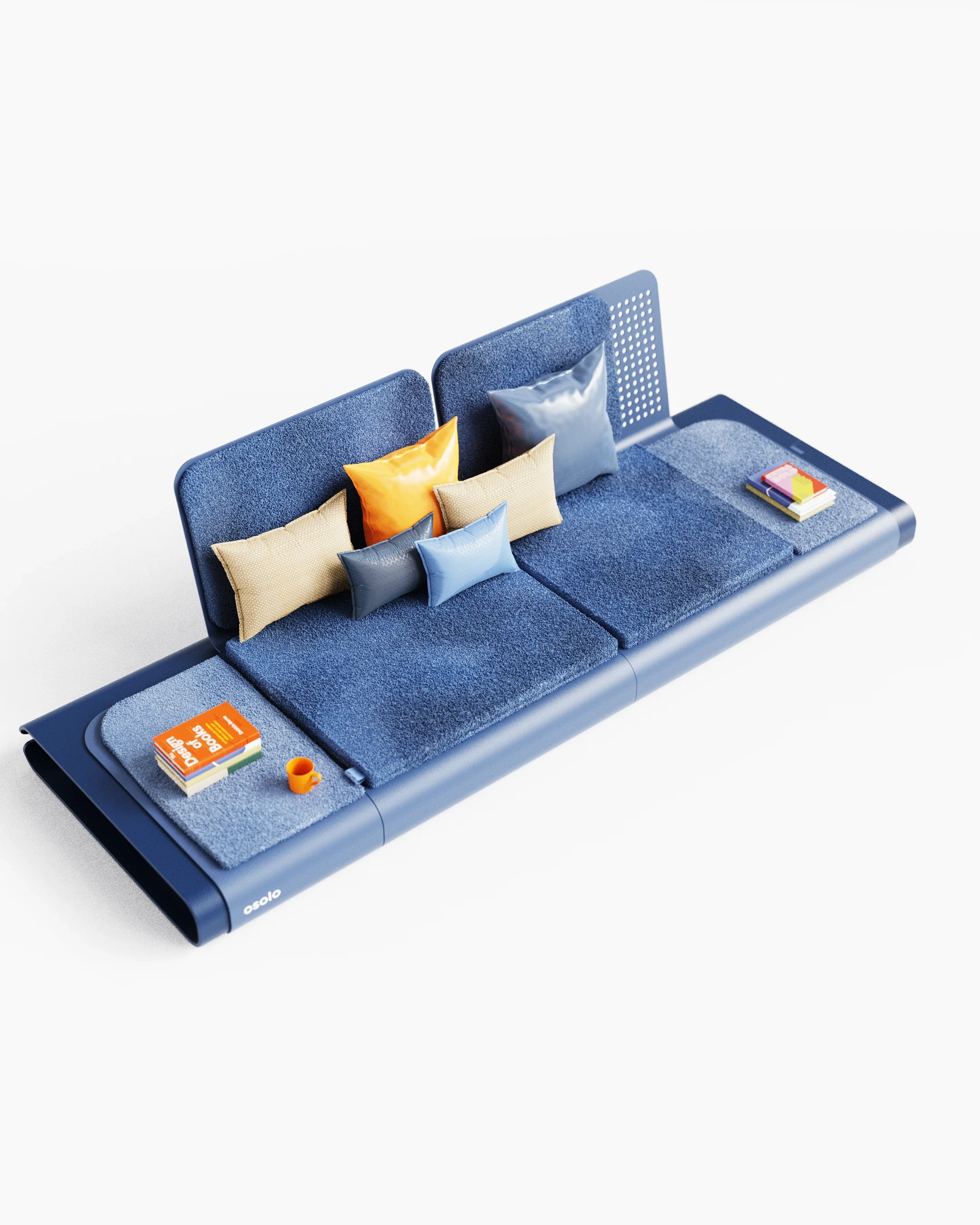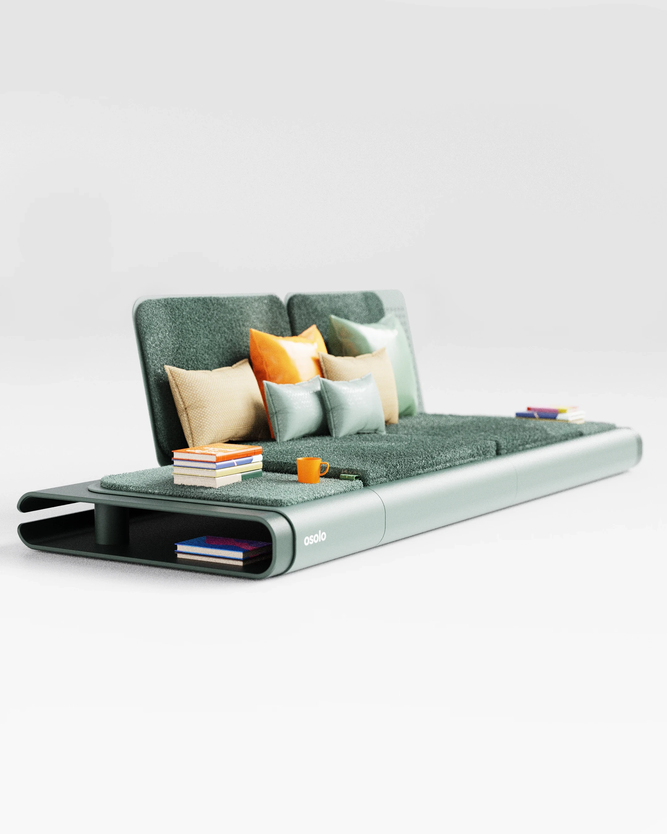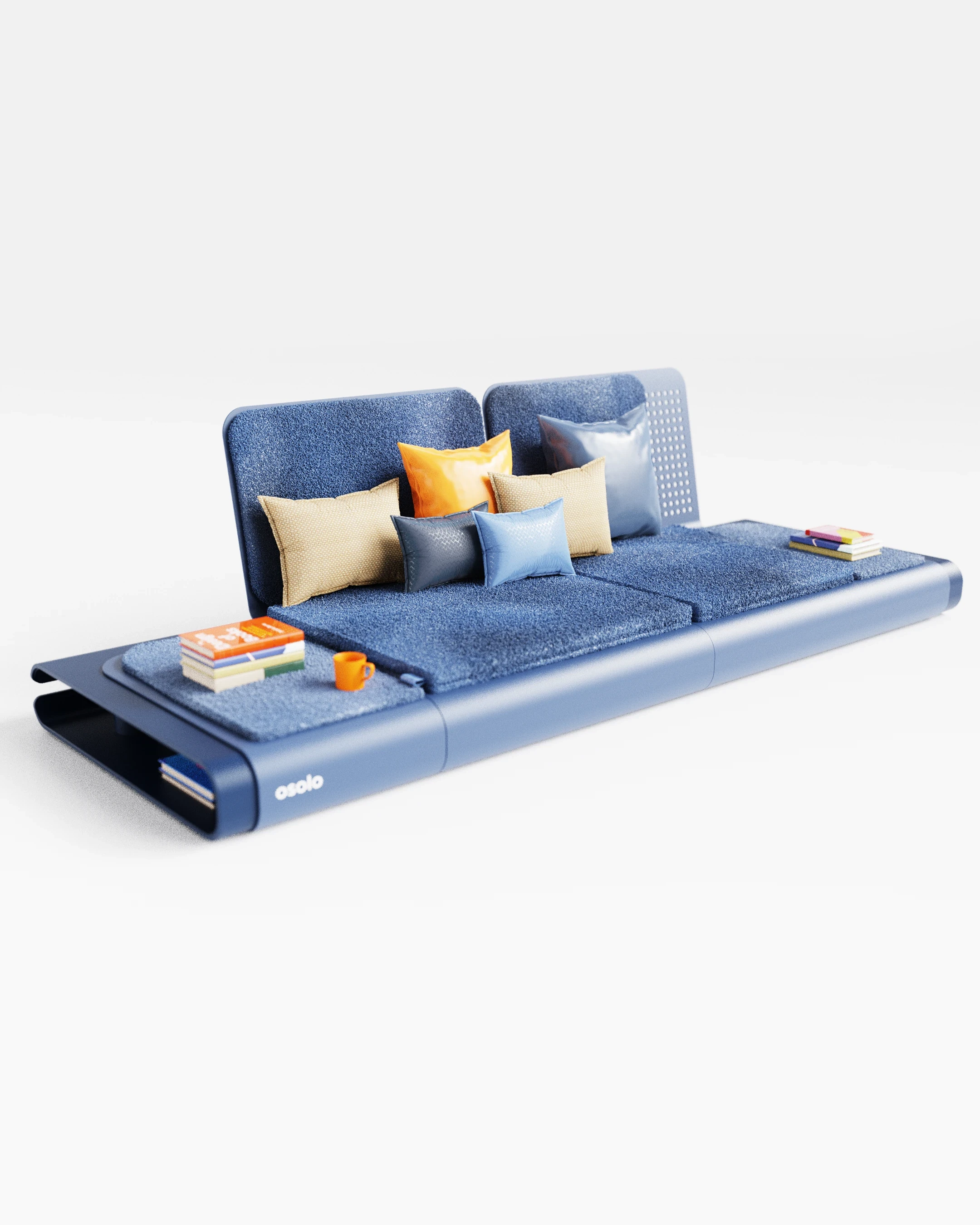 The Osolo seating system was developed as a continuation of a previously established design language, utilizing a single-piece folded metal body. This metal structure is used as both the primary support and the architectural platform for the unit. Open storage for books and small objects is provided by the hollow volume within the frame. A linear, low profile is created, influenced by traditional seating cultures. Different configurations are made possible through modular cushions and independent backrest elements. Multiple modules can be connected side by side, allowing the system to function as either a single seat or an extended arrangement.