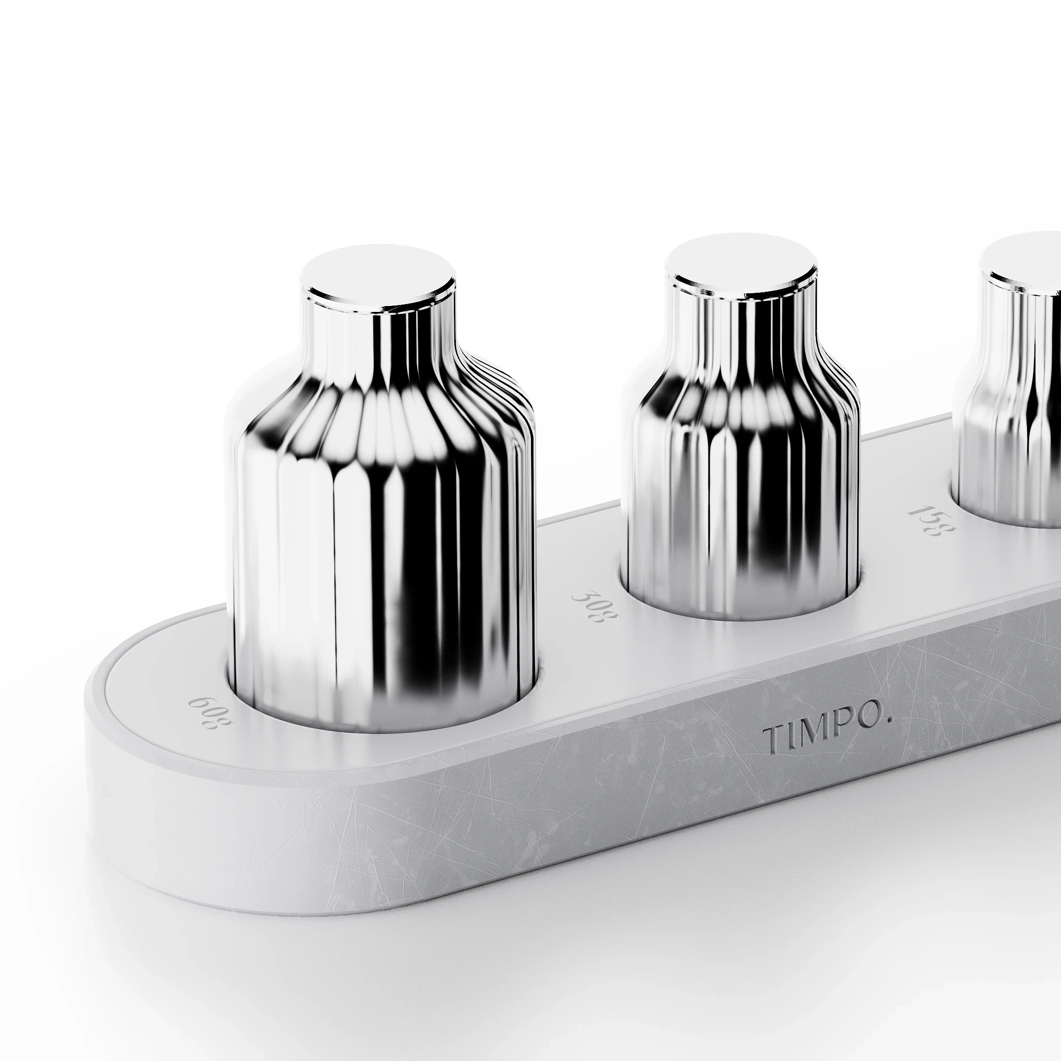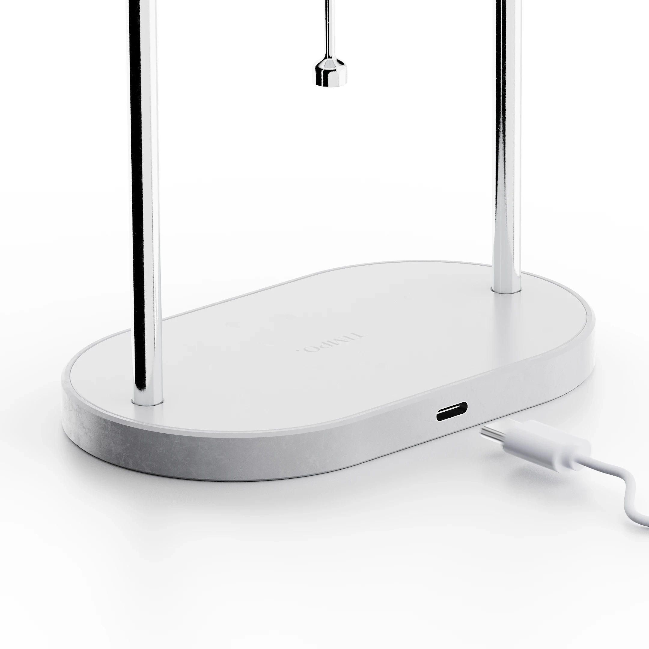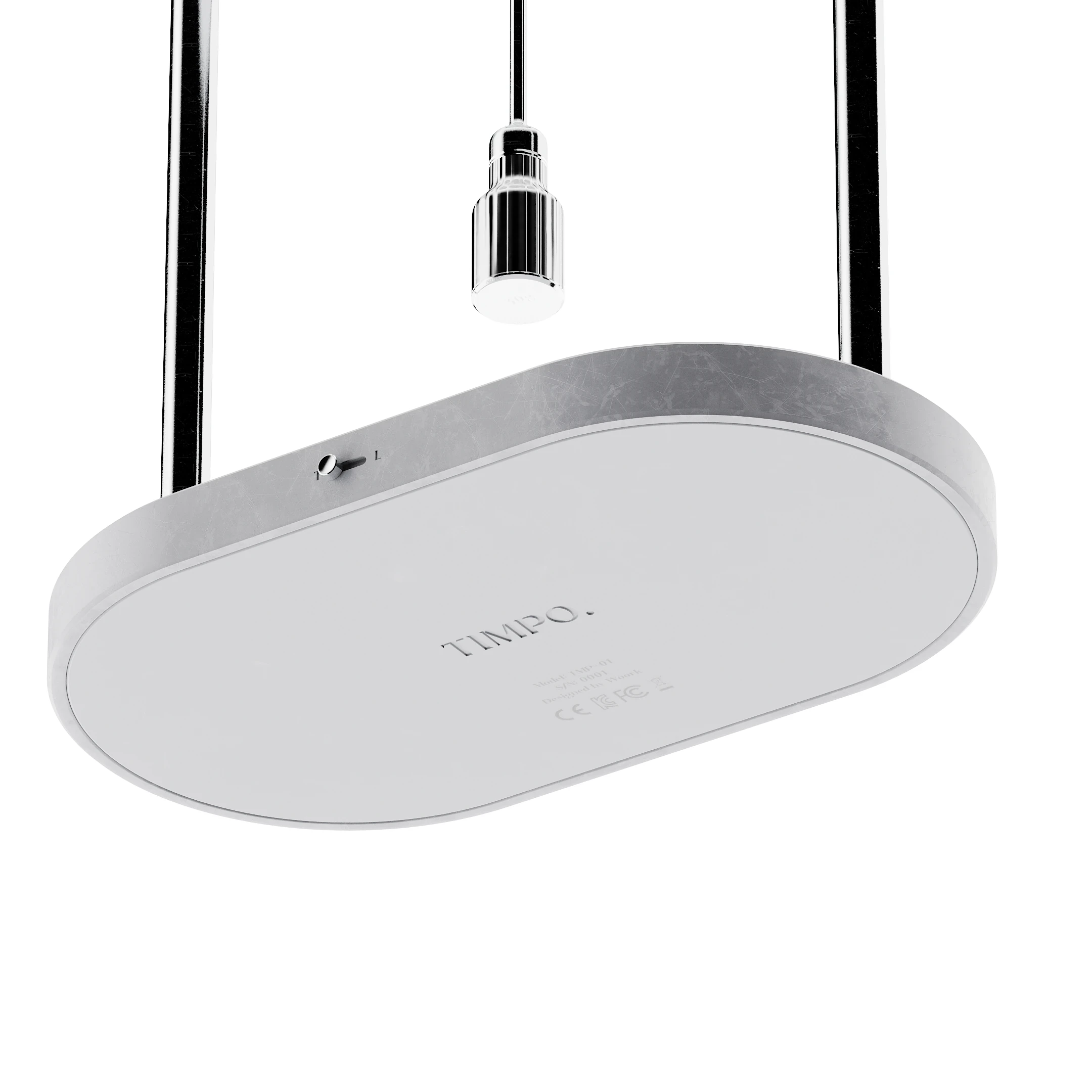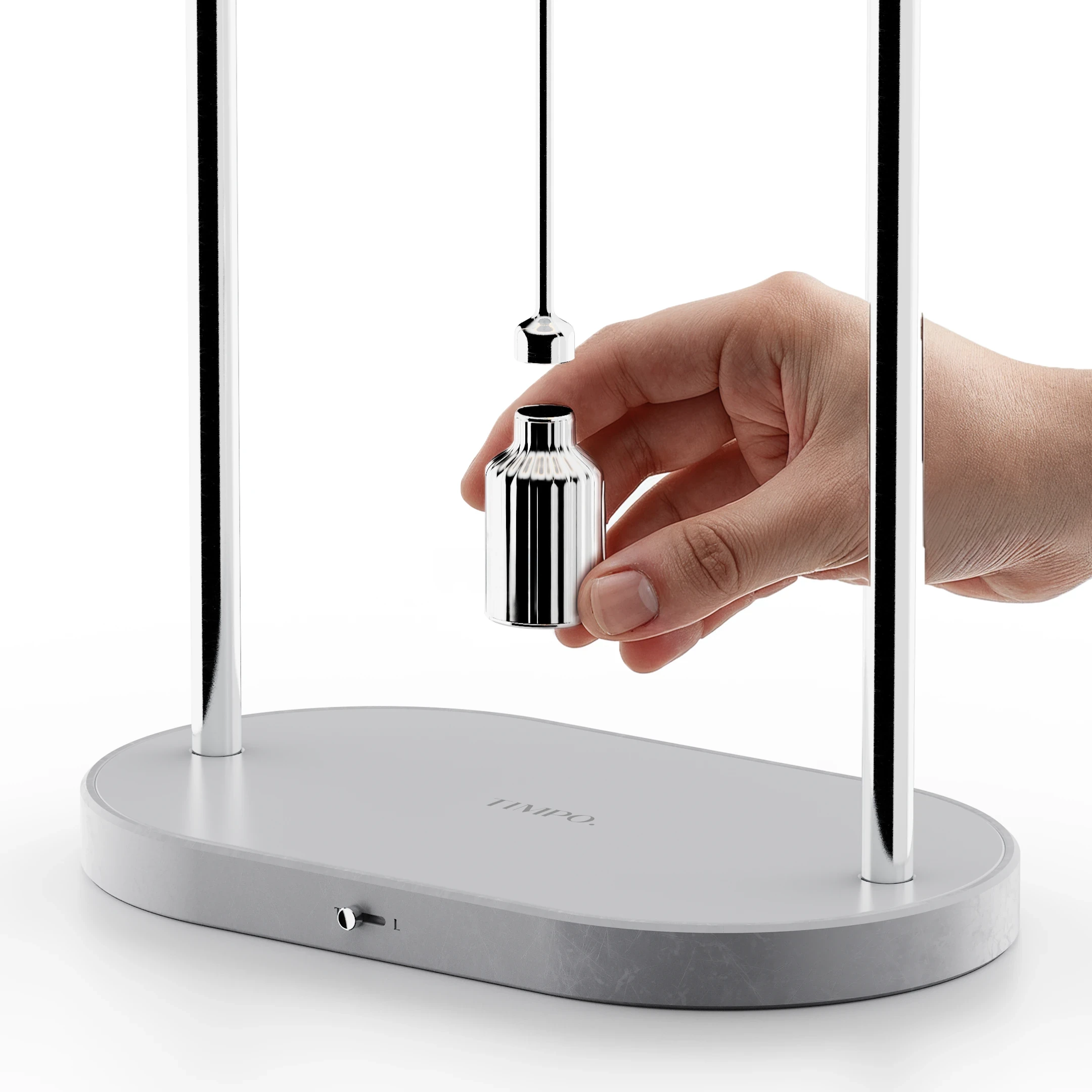 TIMPO. is a conceptual timepiece where time is experienced through weight rather than numbers. Time is set by attaching physical weights to a central magnet, activating a soft LED light and a pendulum-like motion. As the weight swings, the passage of time is perceived through movement and light. When the selected time ends, motion stops and the light turns off. In lamp mode, brightness is controlled by weight instead of duration. Three weights represent different time lengths, inviting time to be felt, not read.